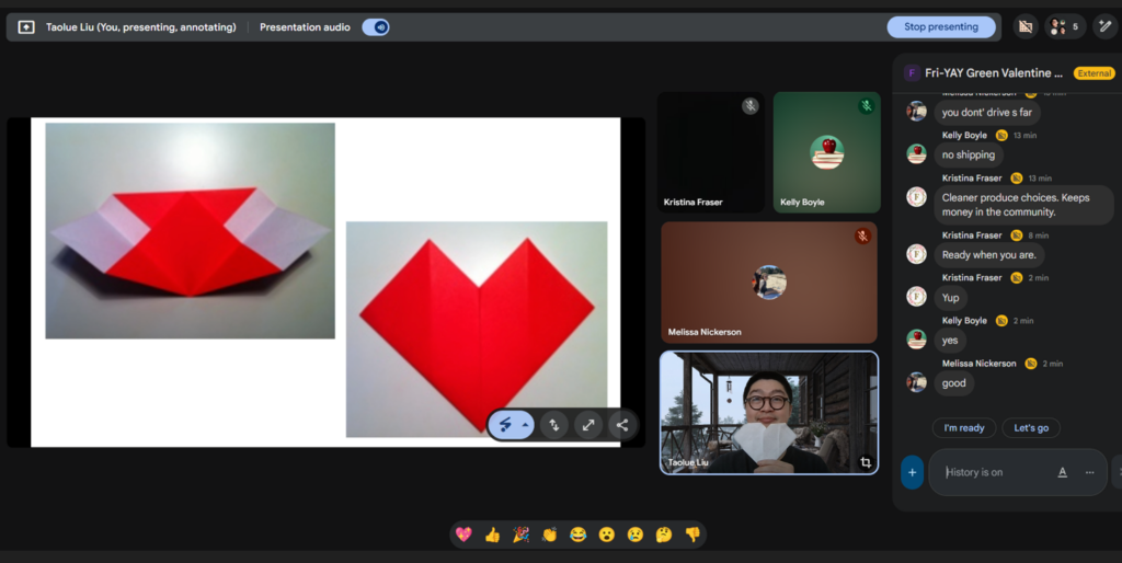 Instead of traditional store-bought gifts, Tao and the students brainstormed innovative ideas to show appreciation for friends without creating extra waste. The highlight of the event was our “get crafty” segment: transforming recyclable materials into beautiful, hand-folded origami heart cards.