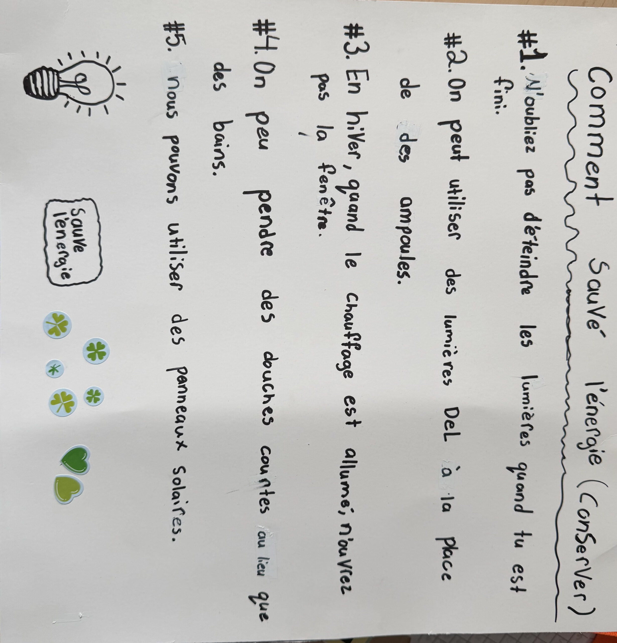 Students at École Beau-Port impressed teachers by using new energy vocabulary confidently and creating posters—including social media challenges for families—to share their learning beyond the classroom.